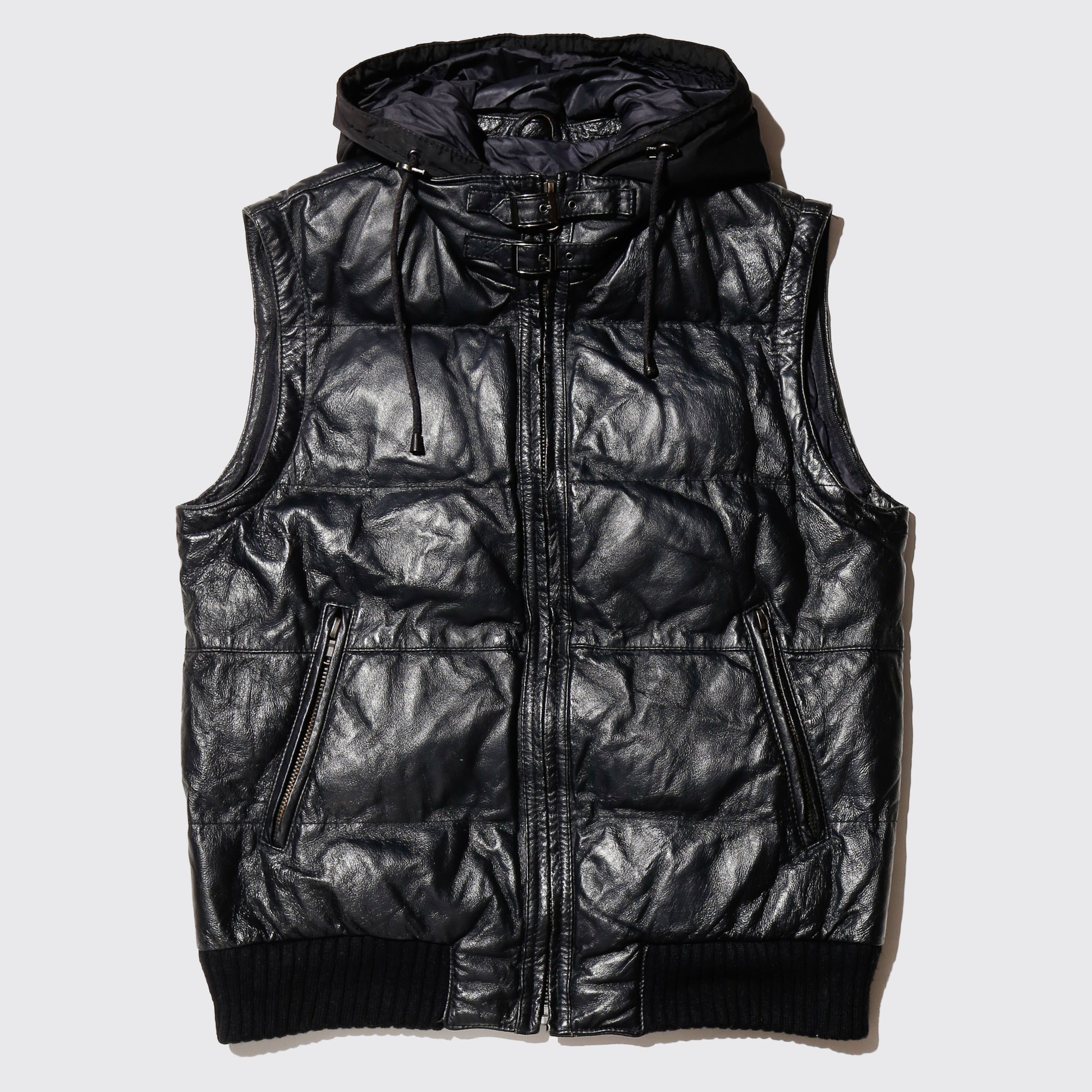 vintage hybrid leather padded vest , detachable hoodie